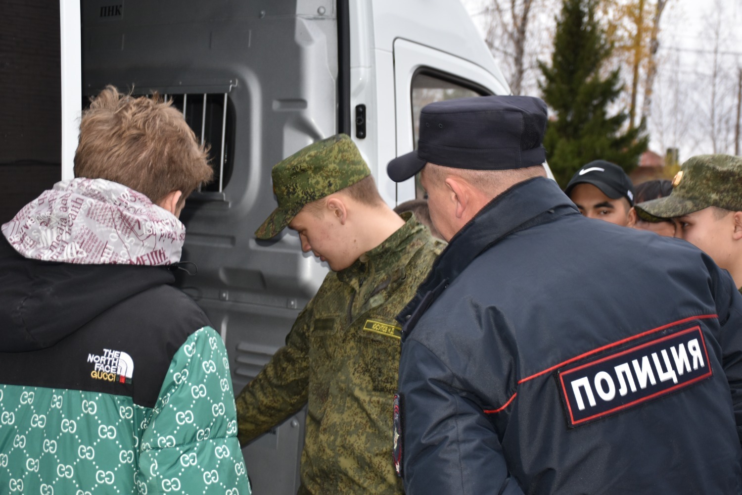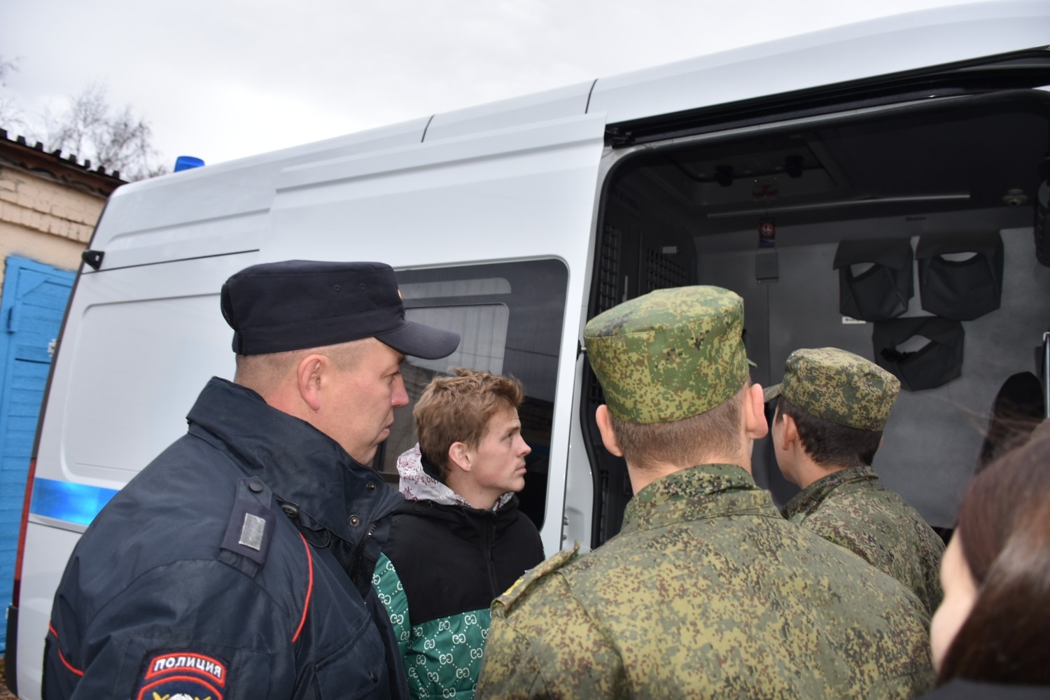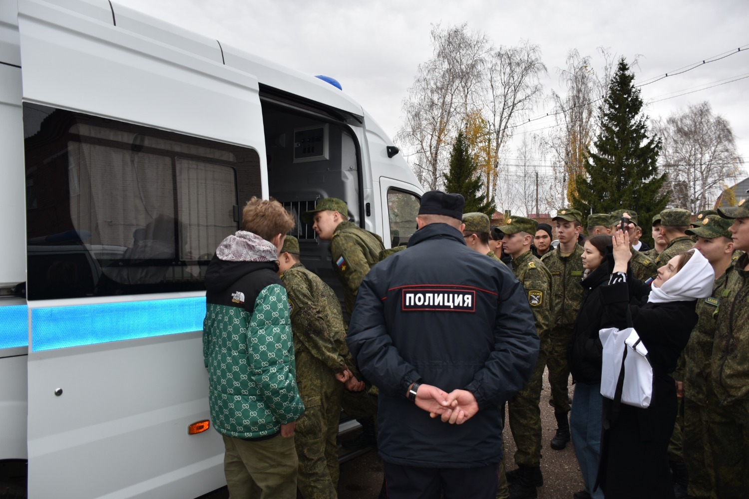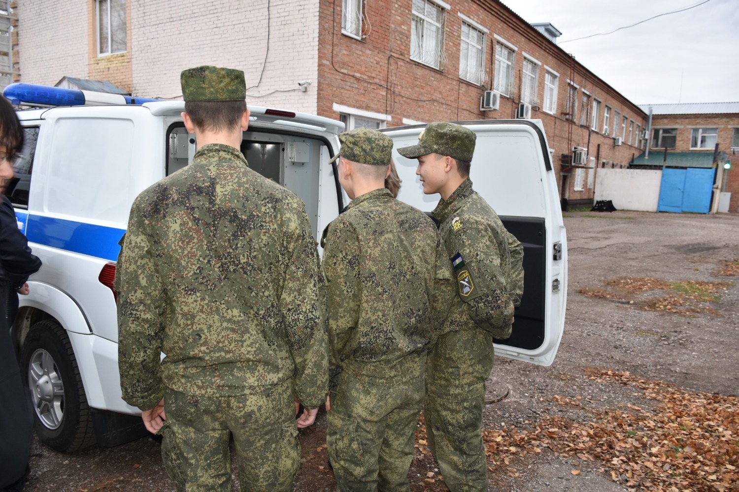 На площадке перед зданием ОМВД кадеты ознакомились со спецтехникой - автомобилем патрульно-постовой службы и автозаком, примерили на себя бронежилет, каску.
