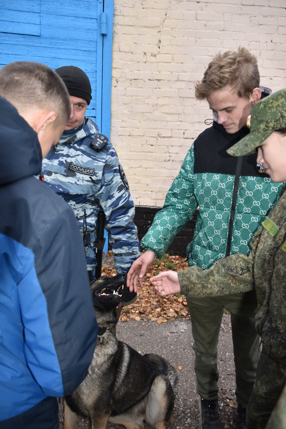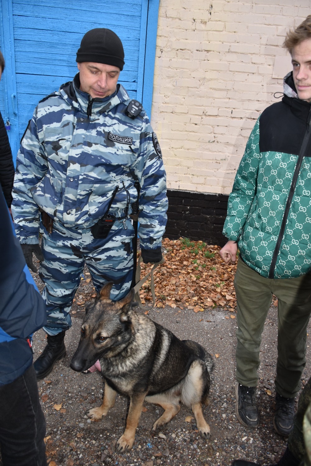 В кинологической группе молодые люди оживлённо расспрашивали о служебных собаках, о возрасте, дрессировке, питании и т. д. На все вопросы им охотно отвечал старший инспектор-кинолог лейтенант полиции Вадим Смирнов.