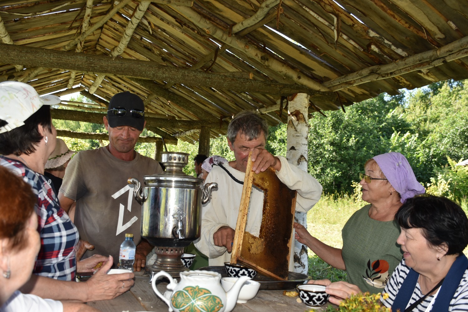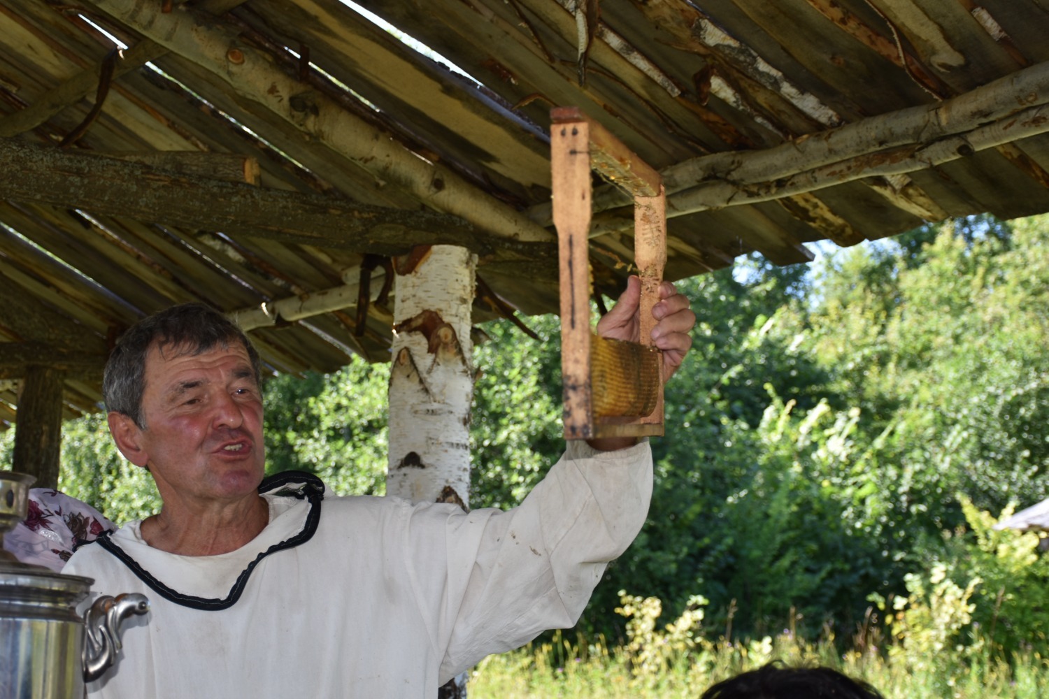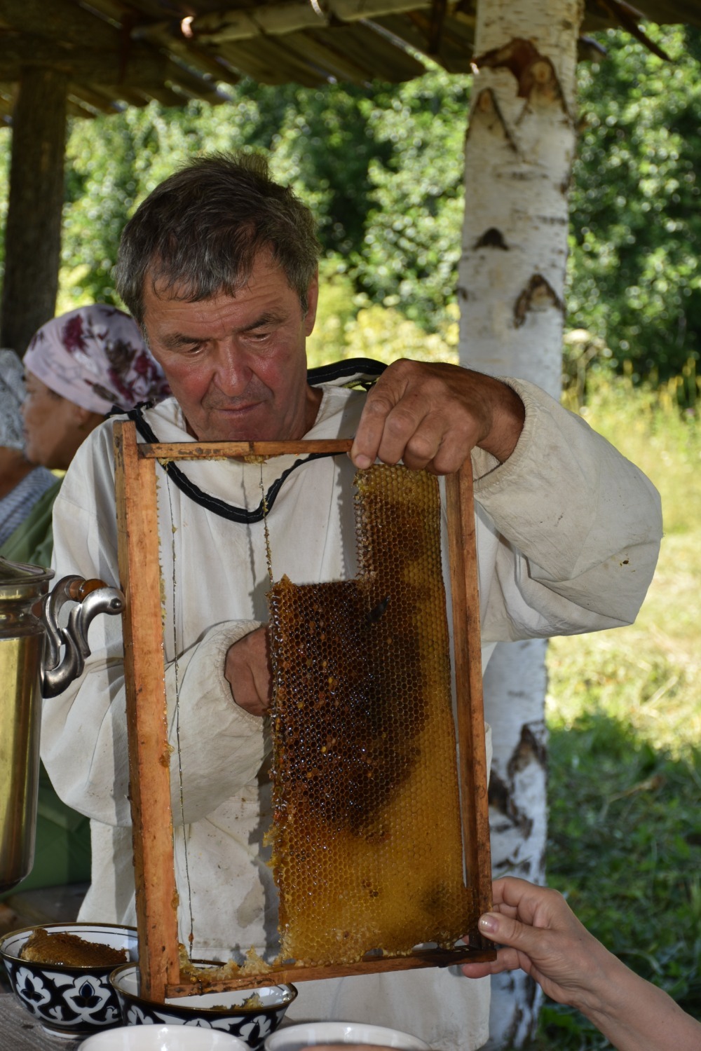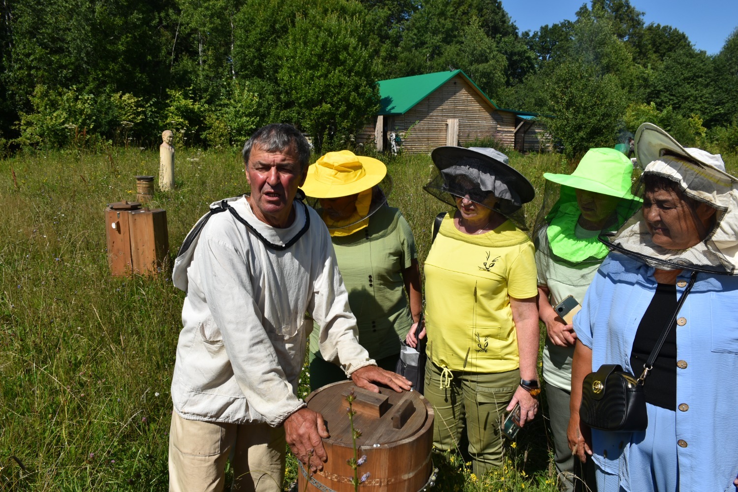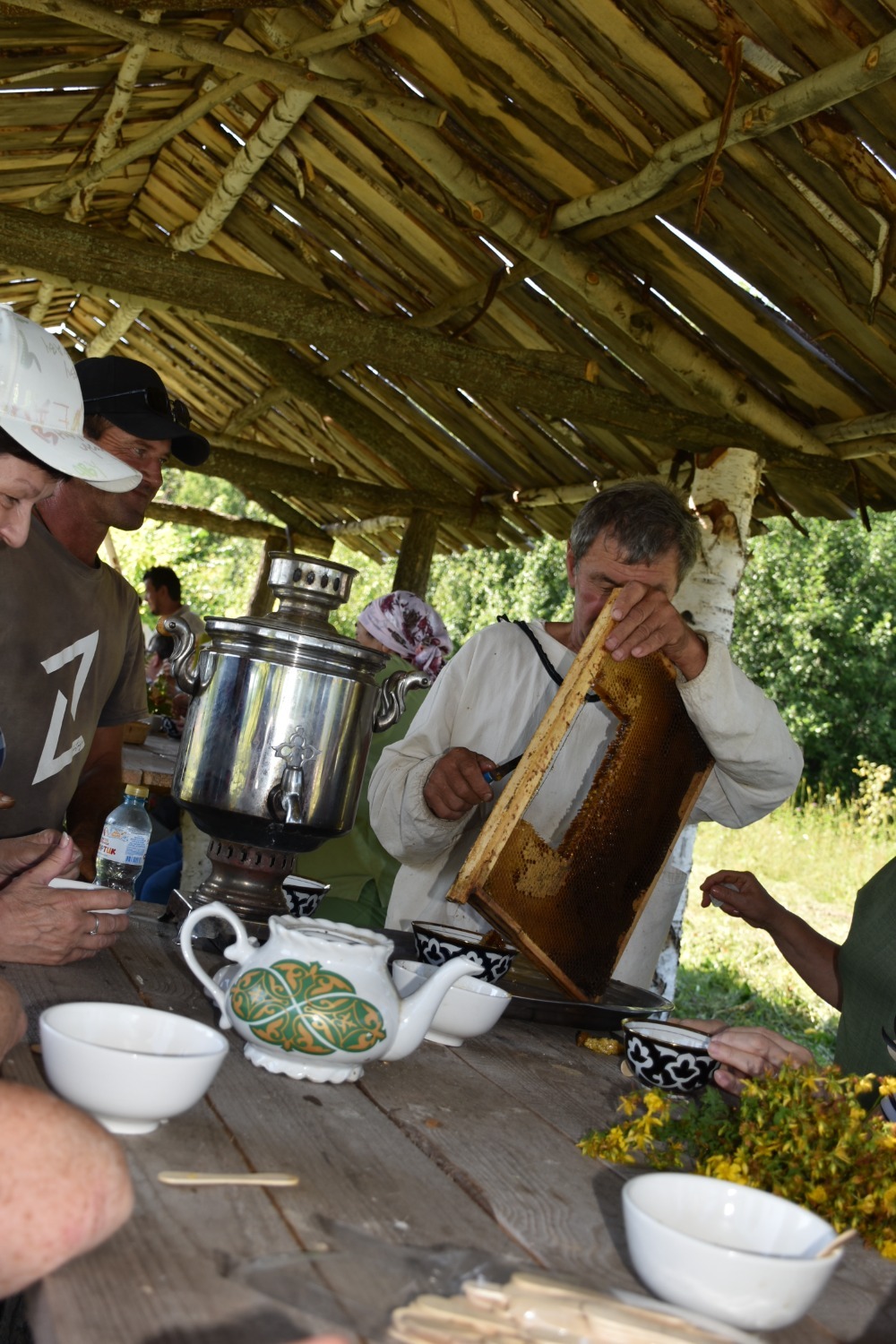 А у нас далее в программе - посещение пасеки. Добирались до ней по лесной тропе. В одном месте перешли по деревянному настилу ручей. И вот виднеются деревянные домики и хозпостройки. Здесь пасечник с большим стажем Булат-агай рассказал об истории пчеловодства, показал дом пчеловода с музейными экспонатами по теме. Раздав всем панамы с антимоскитными сетками, продемонстрировал различные ульи, колоды, борти и угостили ароматным чаем и сотовым мёдом разных сортов, в том числе с пергой - собранной в соты пчёлами цветочной пыльцой!
