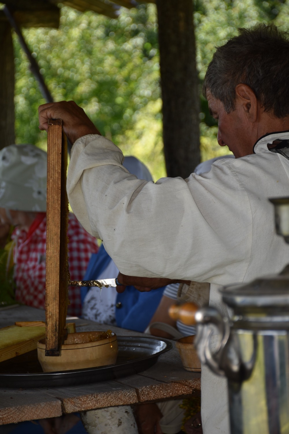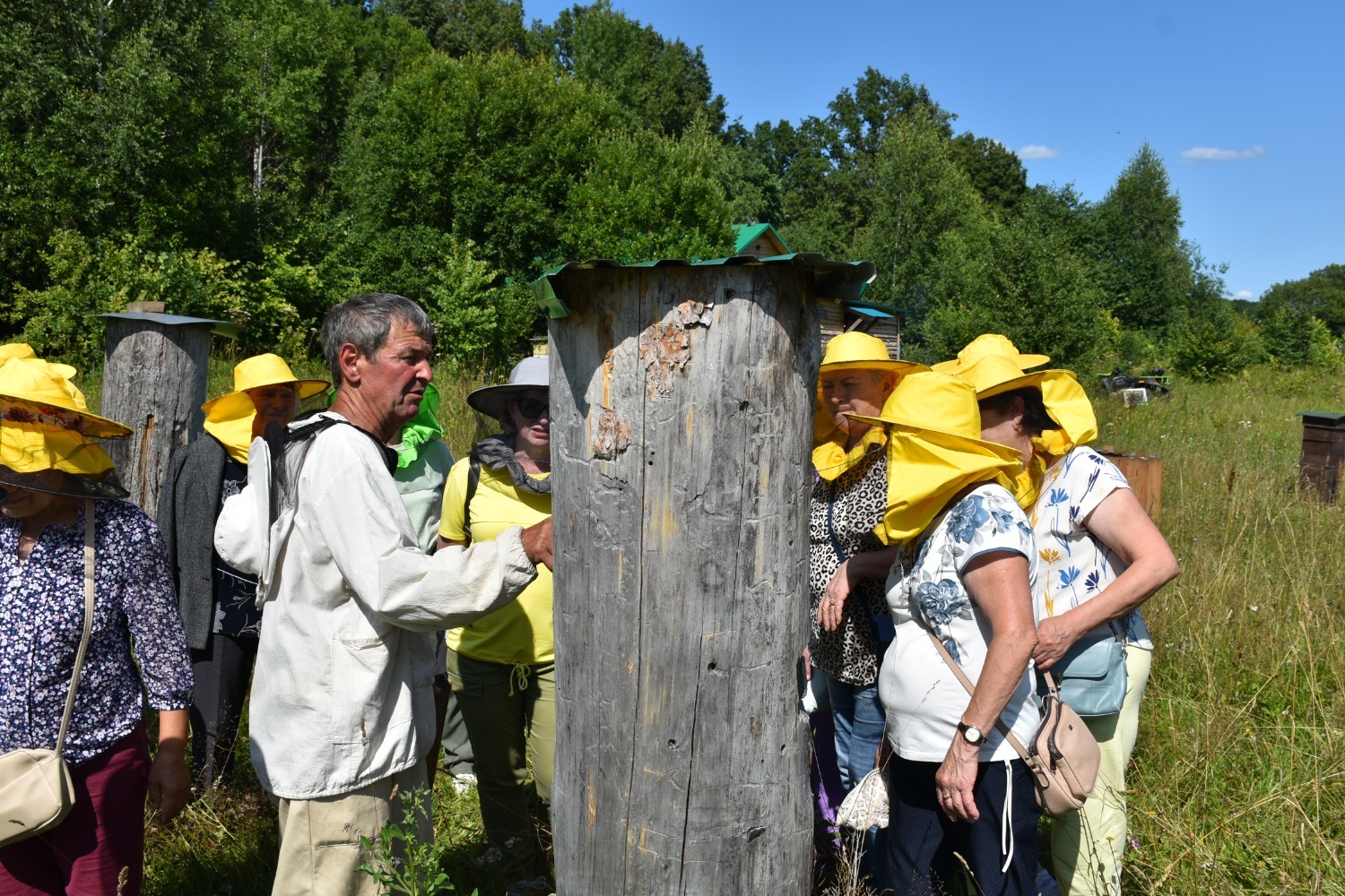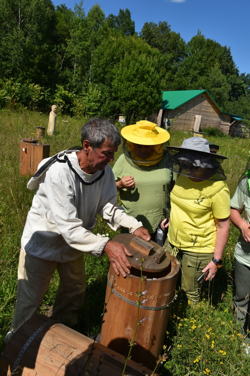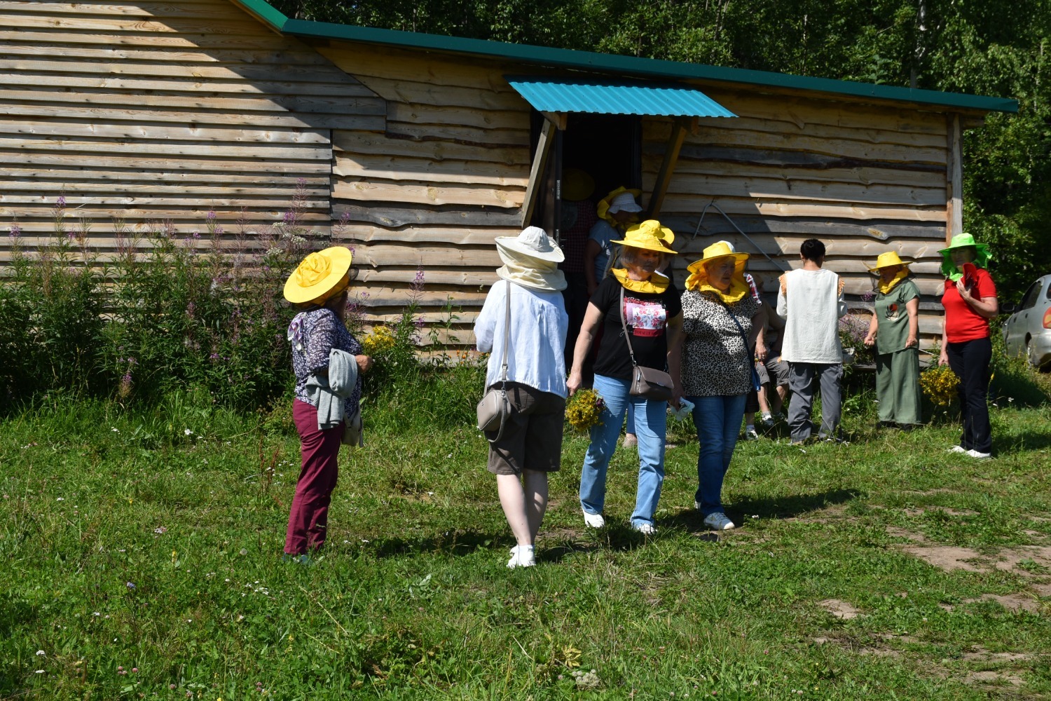А у нас далее в программе - посещение пасеки. Добирались до ней по лесной тропе. В одном месте перешли по деревянному настилу ручей. И вот виднеются деревянные домики и хозпостройки. Здесь пасечник с большим стажем Булат-агай рассказал об истории пчеловодства, показал дом пчеловода с музейными экспонатами по теме. Раздав всем панамы с антимоскитными сетками, продемонстрировал различные ульи, колоды, борти и угостили ароматным чаем и сотовым мёдом разных сортов, в том числе с пергой - собранной в соты пчёлами цветочной пыльцой!
