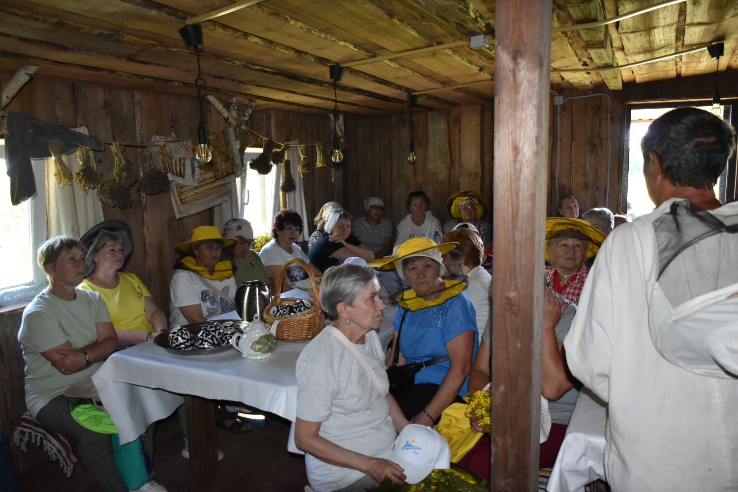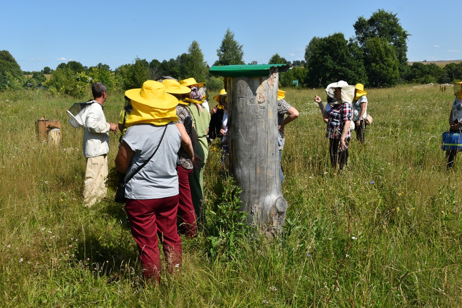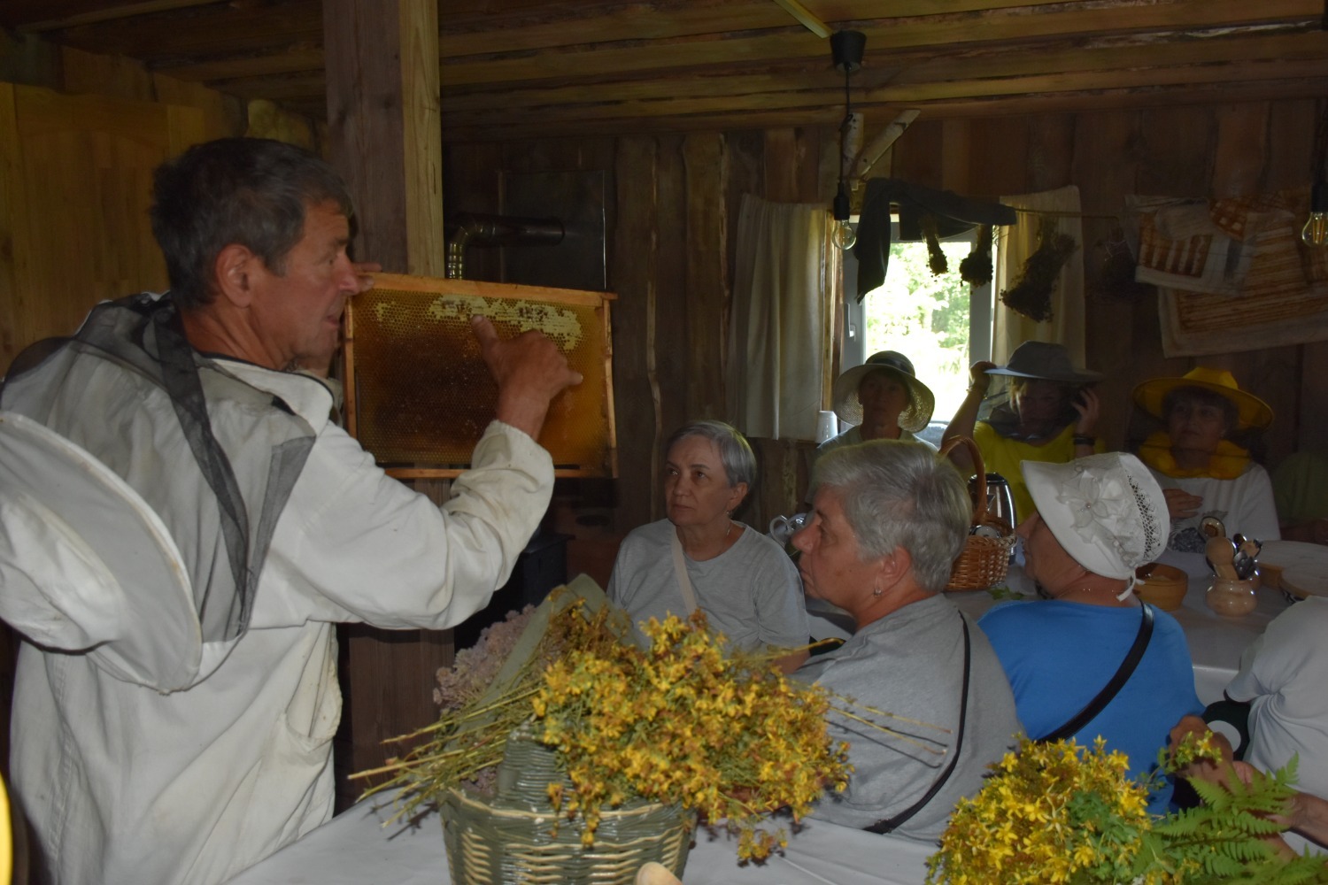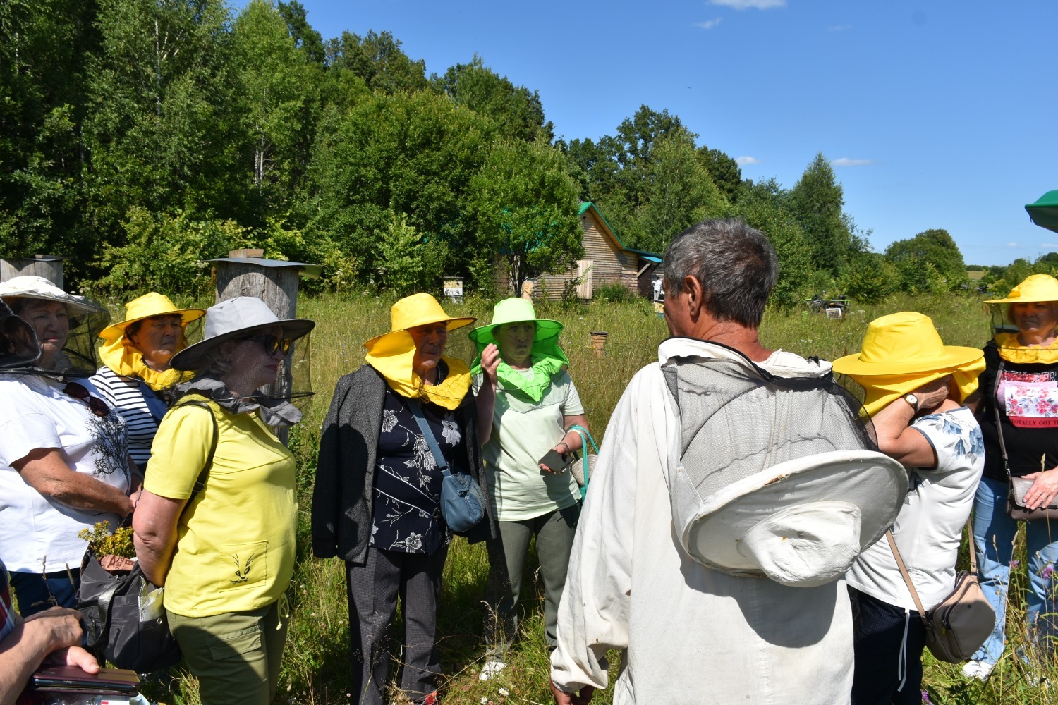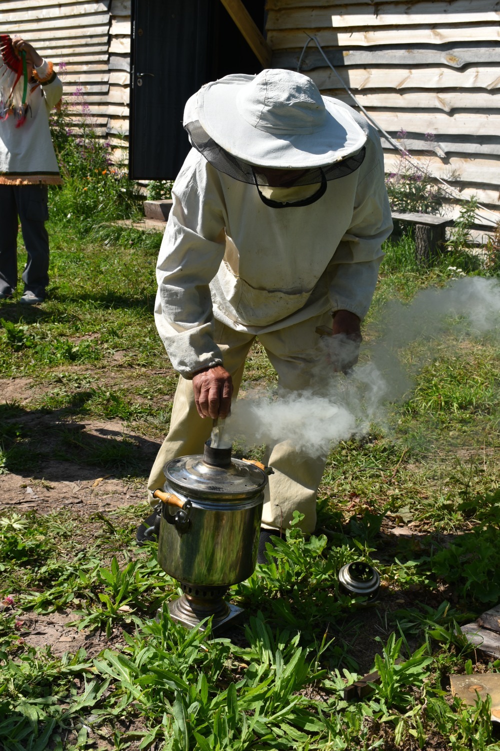 А у нас далее в программе - посещение пасеки. Добирались до ней по лесной тропе. В одном месте перешли по деревянному настилу ручей. И вот виднеются деревянные домики и хозпостройки. Здесь пасечник с большим стажем Булат-агай рассказал об истории пчеловодства, показал дом пчеловода с музейными экспонатами по теме. Раздав всем панамы с антимоскитными сетками, продемонстрировал различные ульи, колоды, борти и угостили ароматным чаем и сотовым мёдом разных сортов, в том числе с пергой - собранной в соты пчёлами цветочной пыльцой!