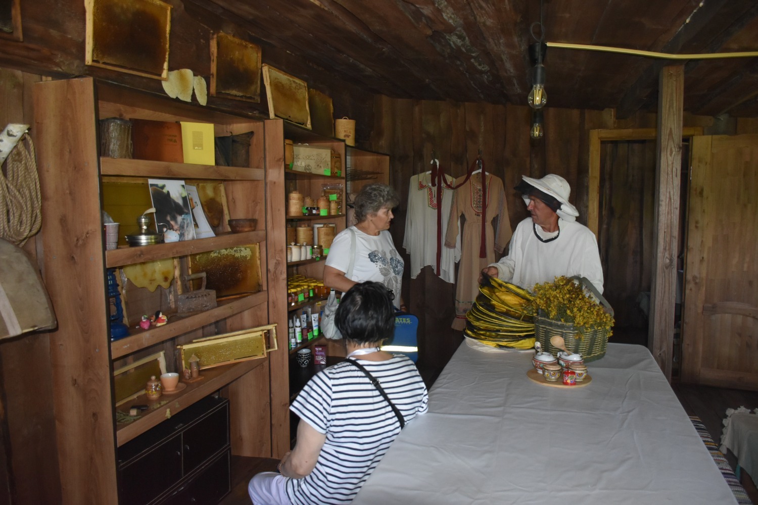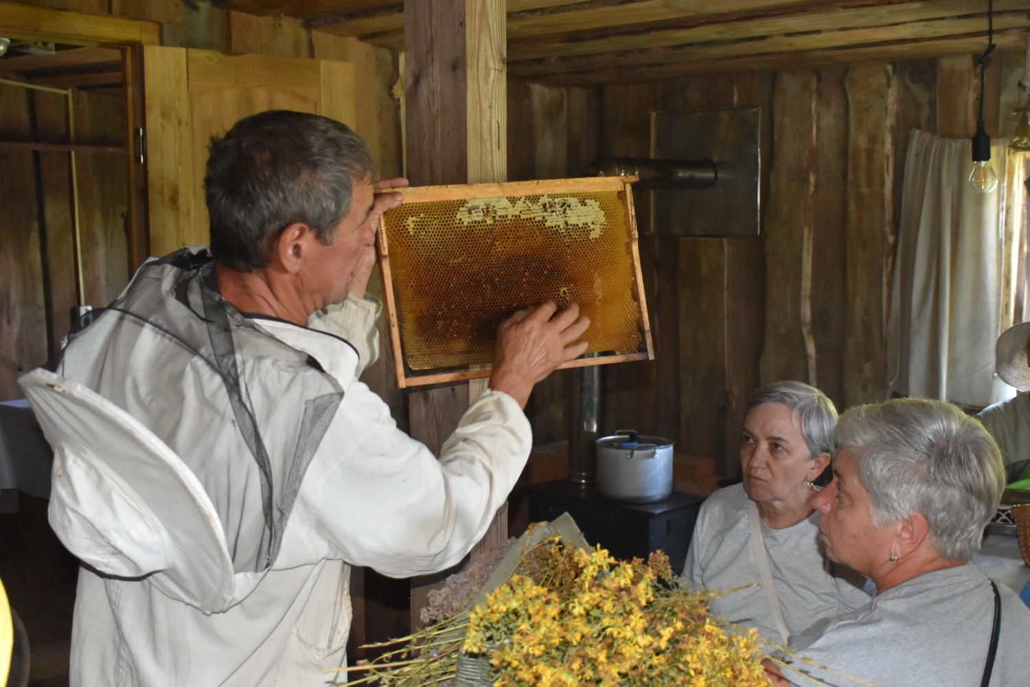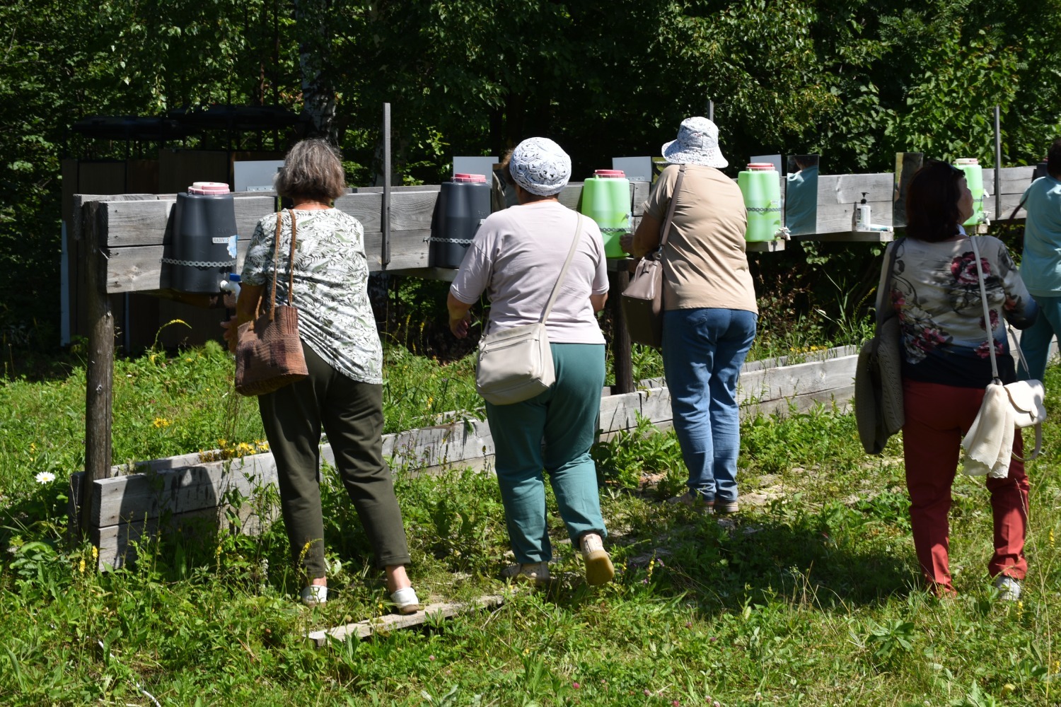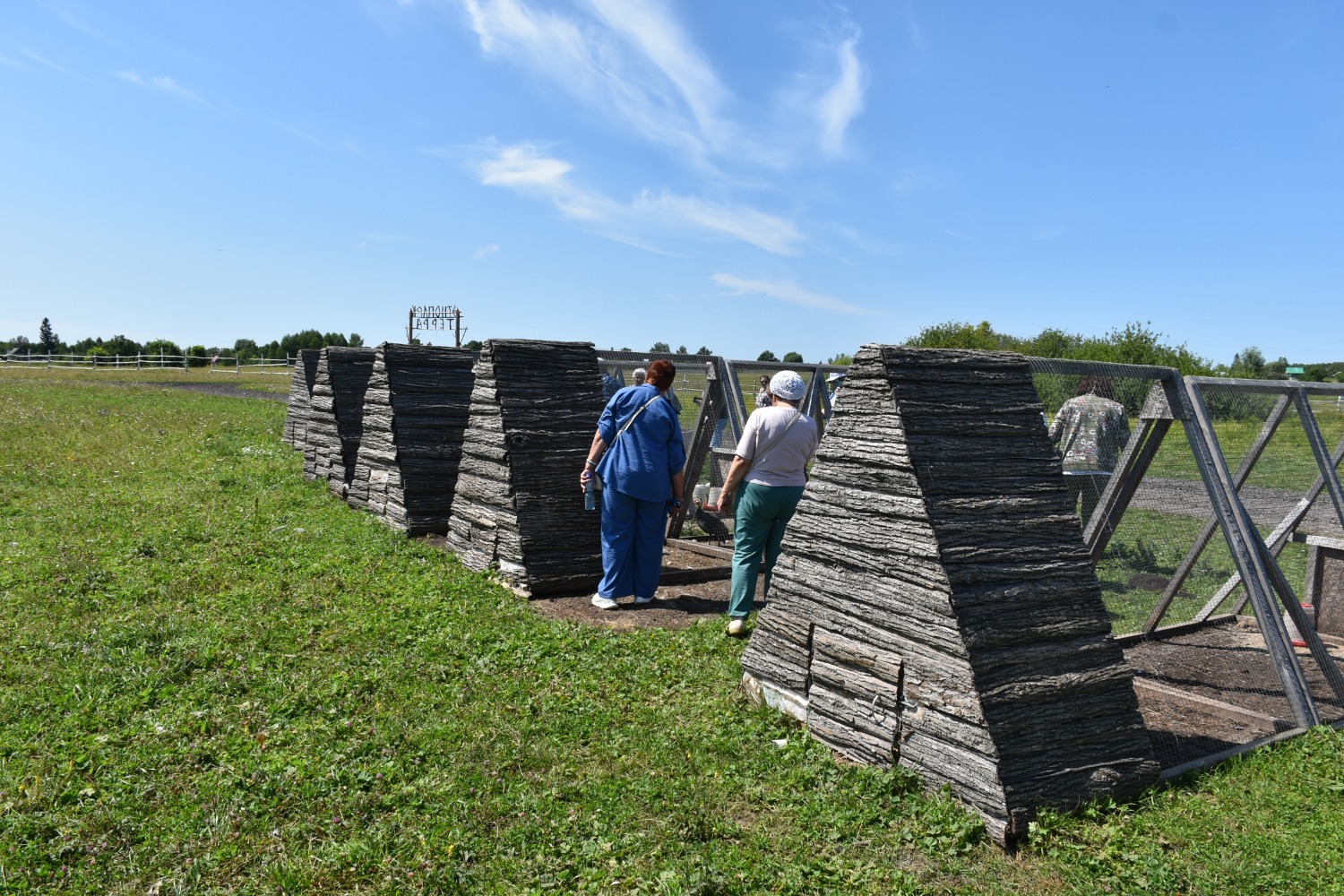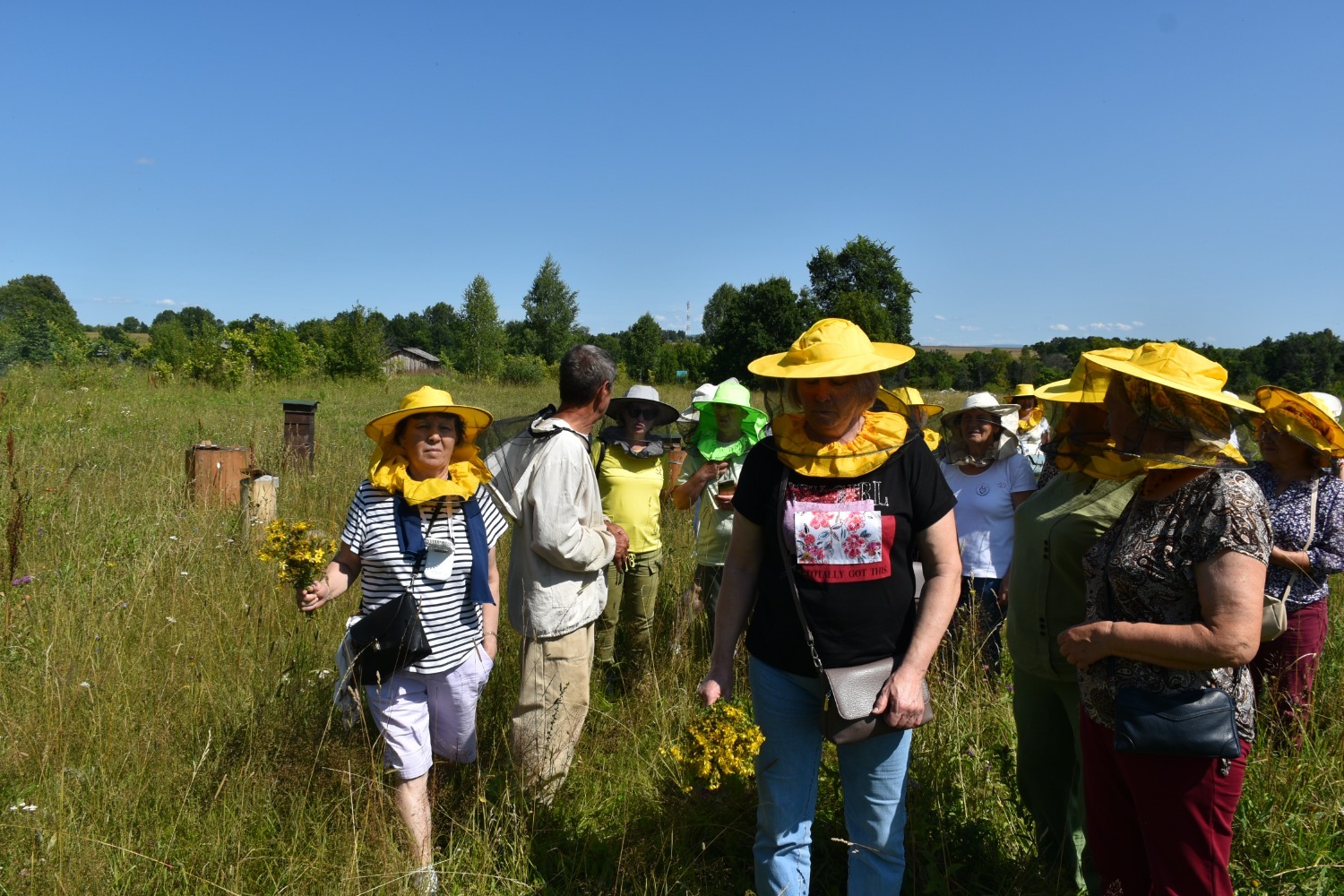 А у нас далее в программе - посещение пасеки. Добирались до ней по лесной тропе. В одном месте перешли по деревянному настилу ручей. И вот виднеются деревянные домики и хозпостройки. Здесь пасечник с большим стажем Булат-агай рассказал об истории пчеловодства, показал дом пчеловода с музейными экспонатами по теме. Раздав всем панамы с антимоскитными сетками, продемонстрировал различные ульи, колоды, борти и угостили ароматным чаем и сотовым мёдом разных сортов, в том числе с пергой - собранной в соты пчёлами цветочной пыльцой!