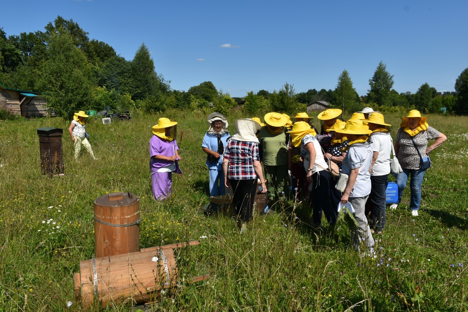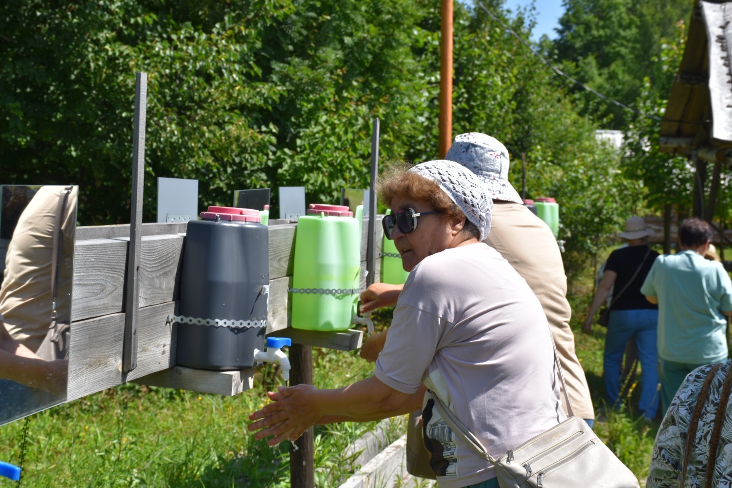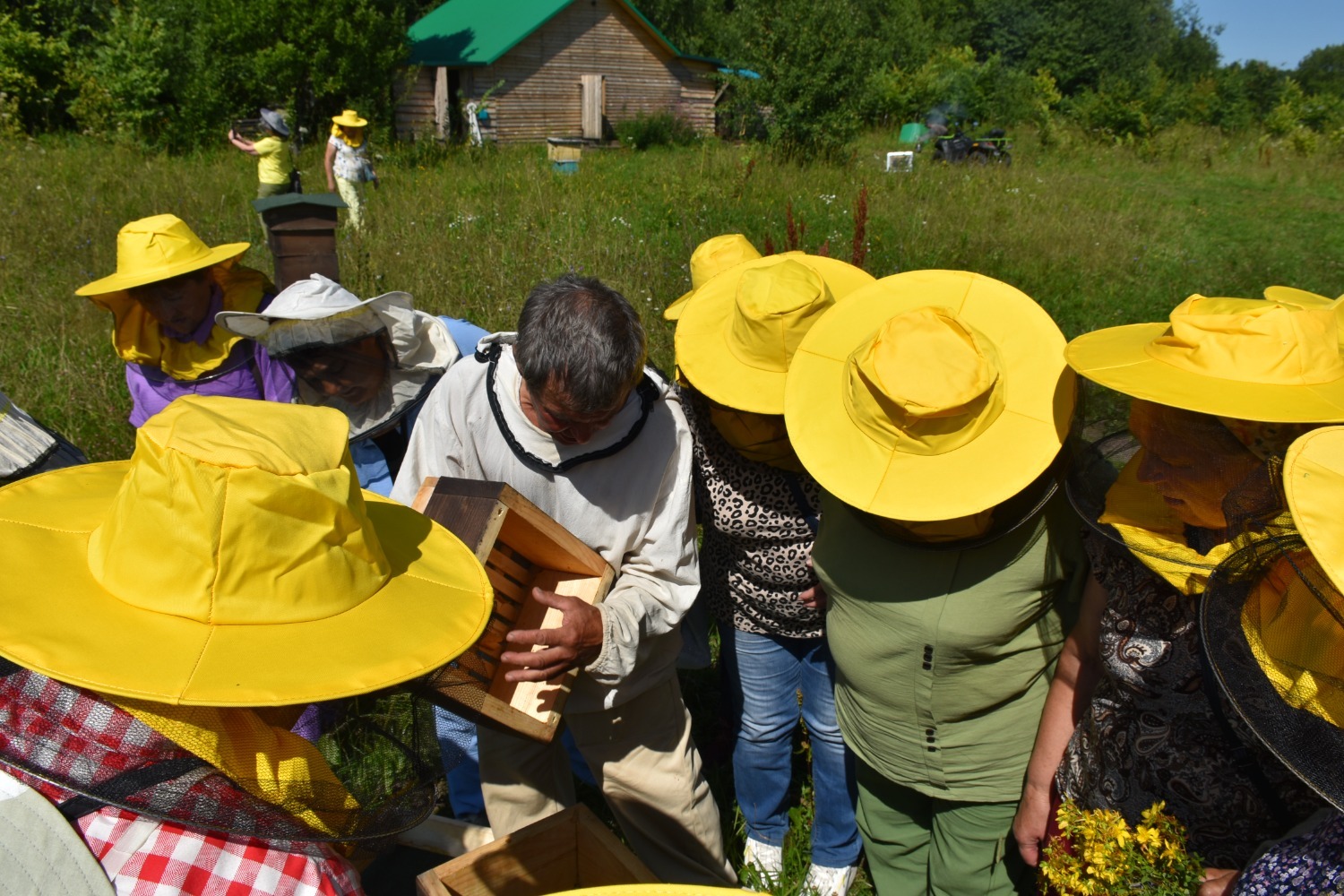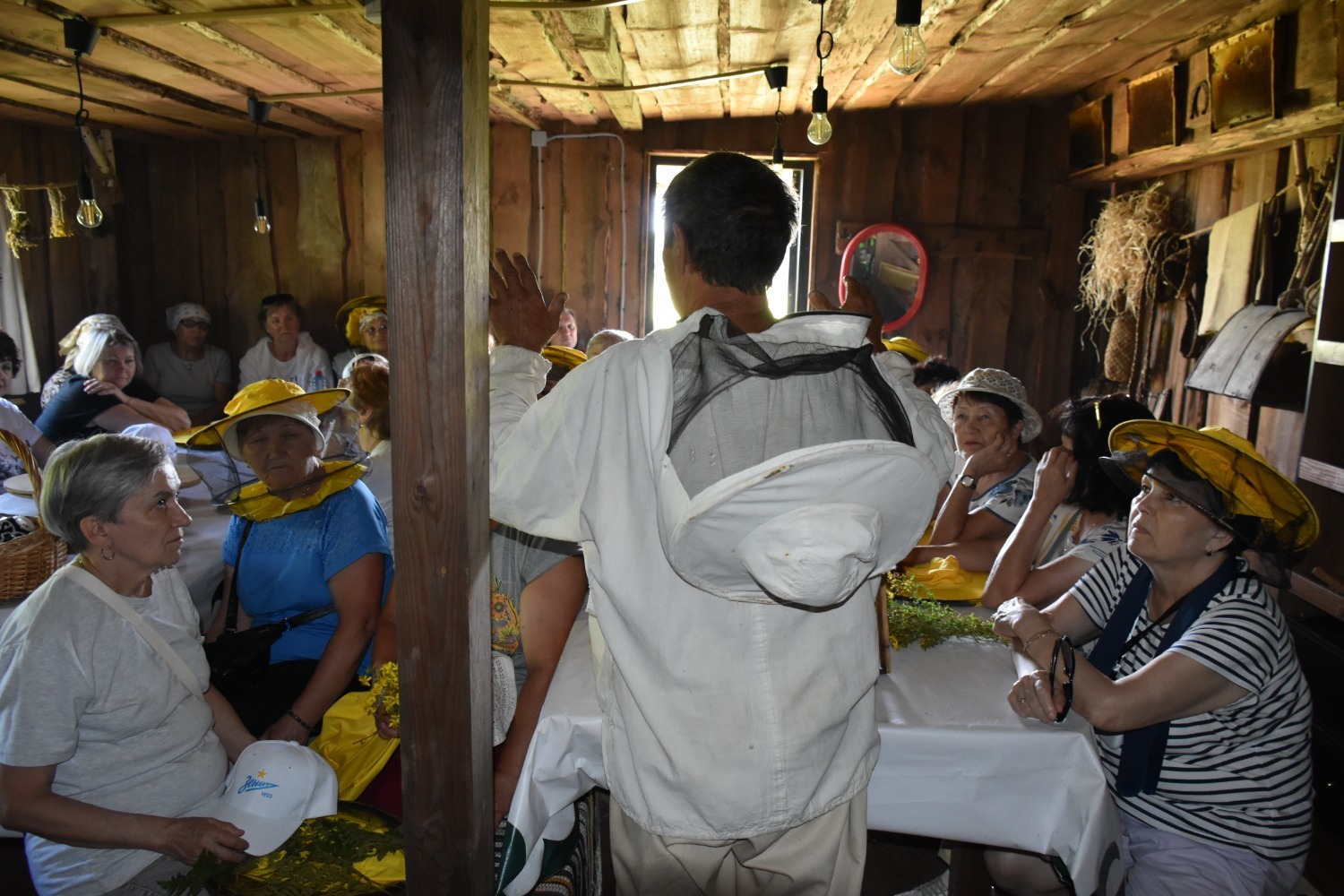 А у нас далее в программе - посещение пасеки. Добирались до ней по лесной тропе. В одном месте перешли по деревянному настилу ручей. И вот виднеются деревянные домики и хозпостройки. Здесь пасечник с большим стажем Булат-агай рассказал об истории пчеловодства, показал дом пчеловода с музейными экспонатами по теме. Раздав всем панамы с антимоскитными сетками, продемонстрировал различные ульи, колоды, борти и угостили ароматным чаем и сотовым мёдом разных сортов, в том числе с пергой - собранной в соты пчёлами цветочной пыльцой!