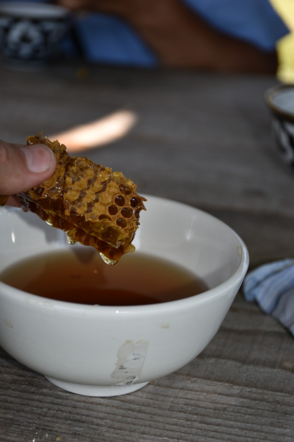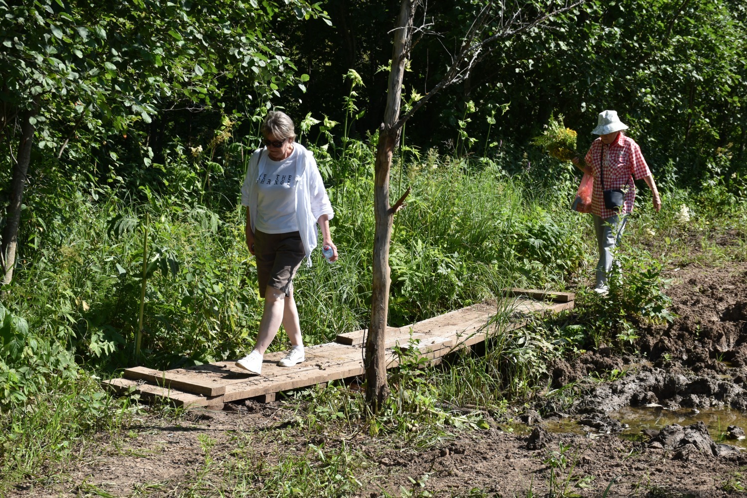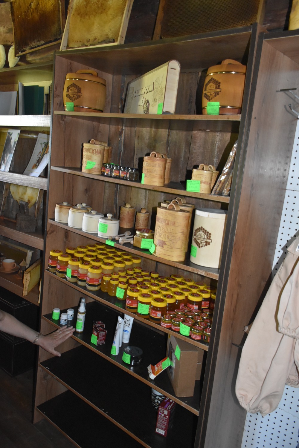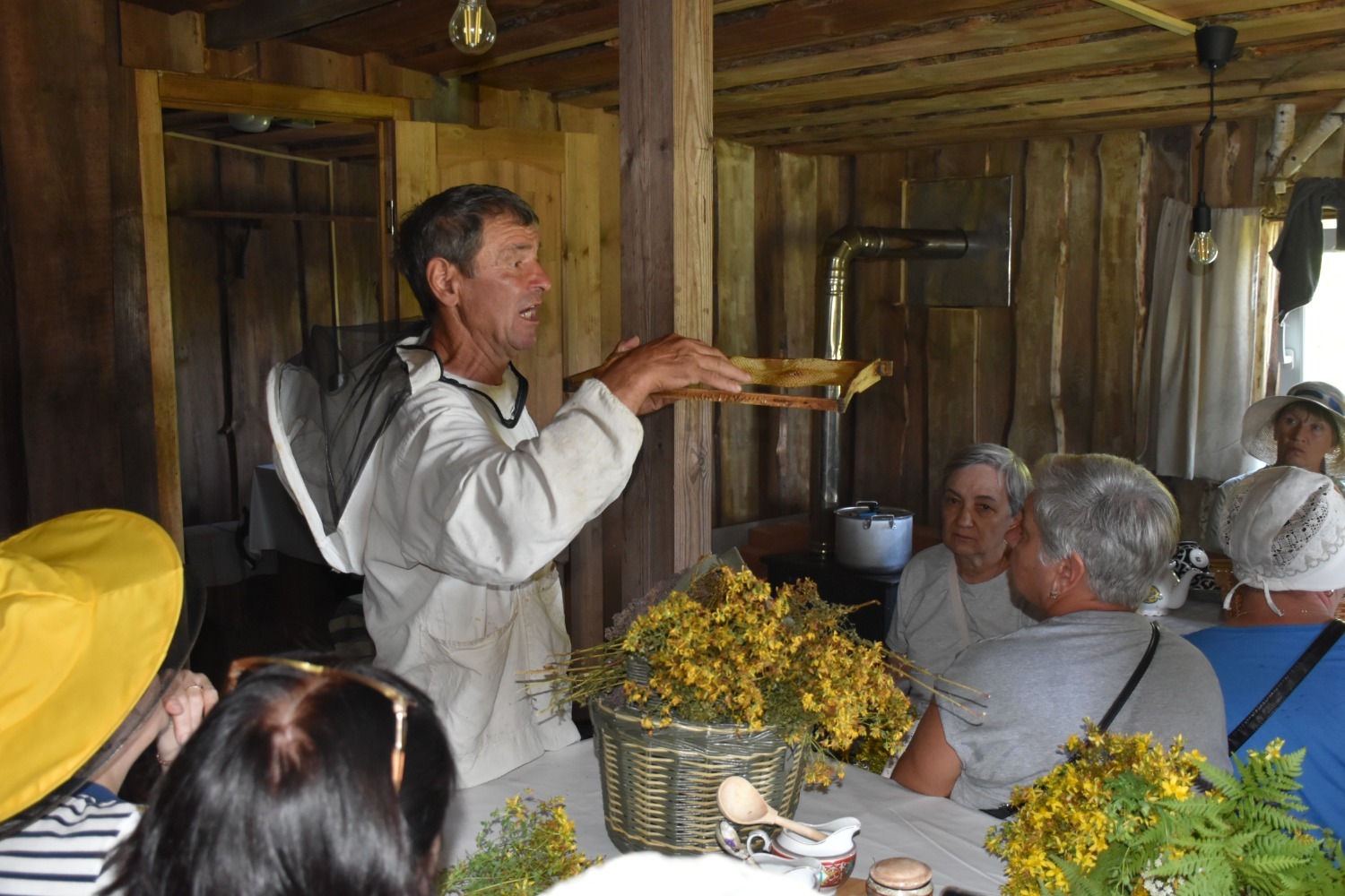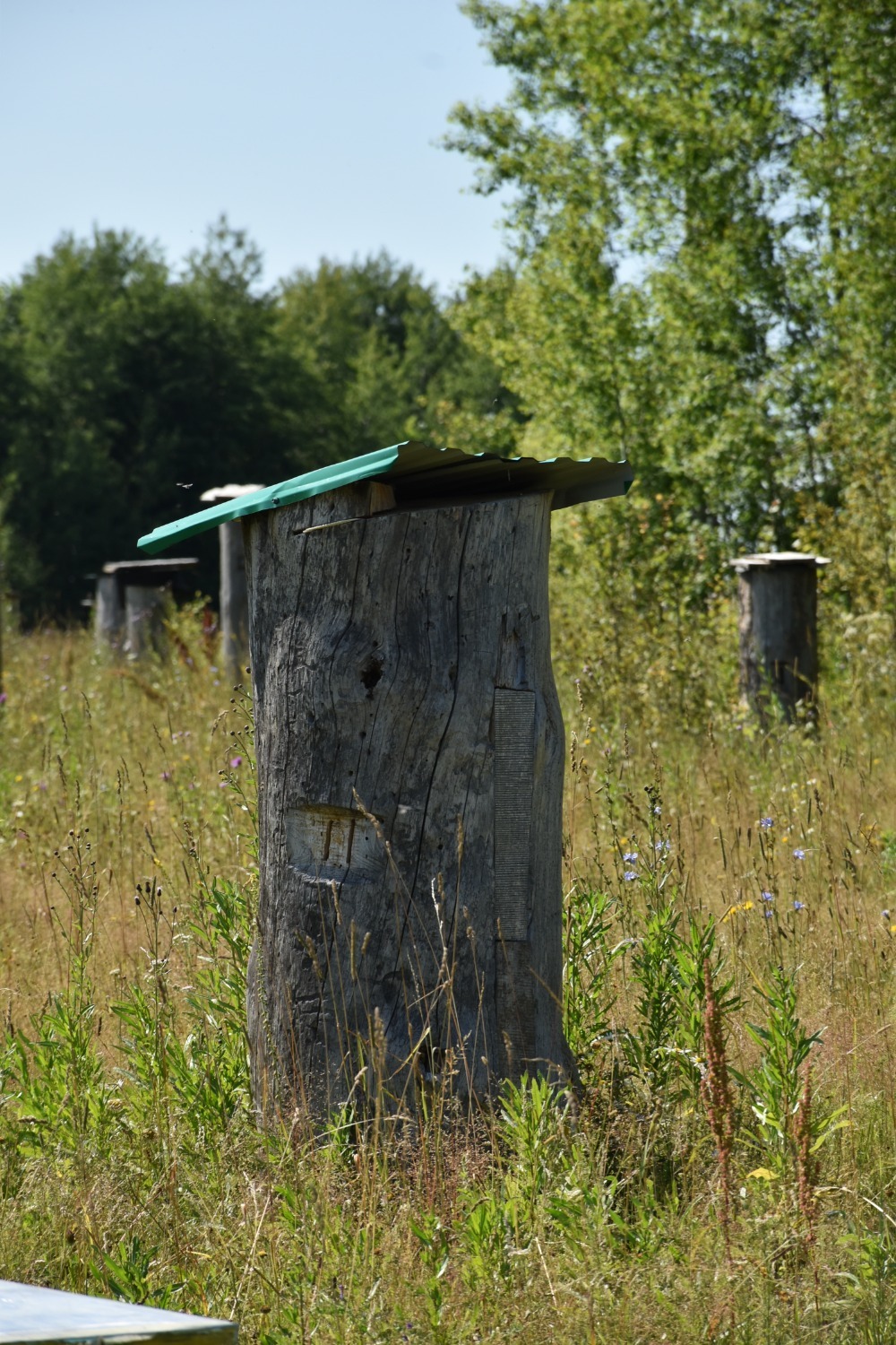 А у нас далее в программе - посещение пасеки. Добирались до ней по лесной тропе. В одном месте перешли по деревянному настилу ручей. И вот виднеются деревянные домики и хозпостройки. Здесь пасечник с большим стажем Булат-агай рассказал об истории пчеловодства, показал дом пчеловода с музейными экспонатами по теме. Раздав всем панамы с антимоскитными сетками, продемонстрировал различные ульи, колоды, борти и угостили ароматным чаем и сотовым мёдом разных сортов, в том числе с пергой - собранной в соты пчёлами цветочной пыльцой!