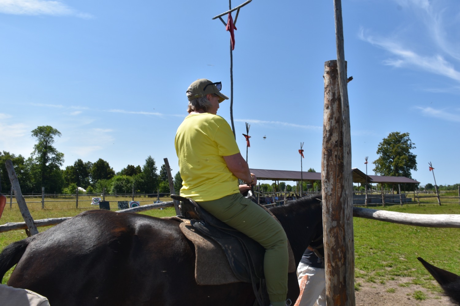 Пока одни вставали в очередь к деревянному помосту, с которого удобнее взбираться на лошадь, другие пробовали свои силы и меткость в стрельбе из лука. Мастер-класс проводила Камилла. Надо отдать должное женскому терпению, выдержке и обучаемости - многие туристки точно пускали в мишень стрелы! Не зря среди снайперов всегда немало женщин!