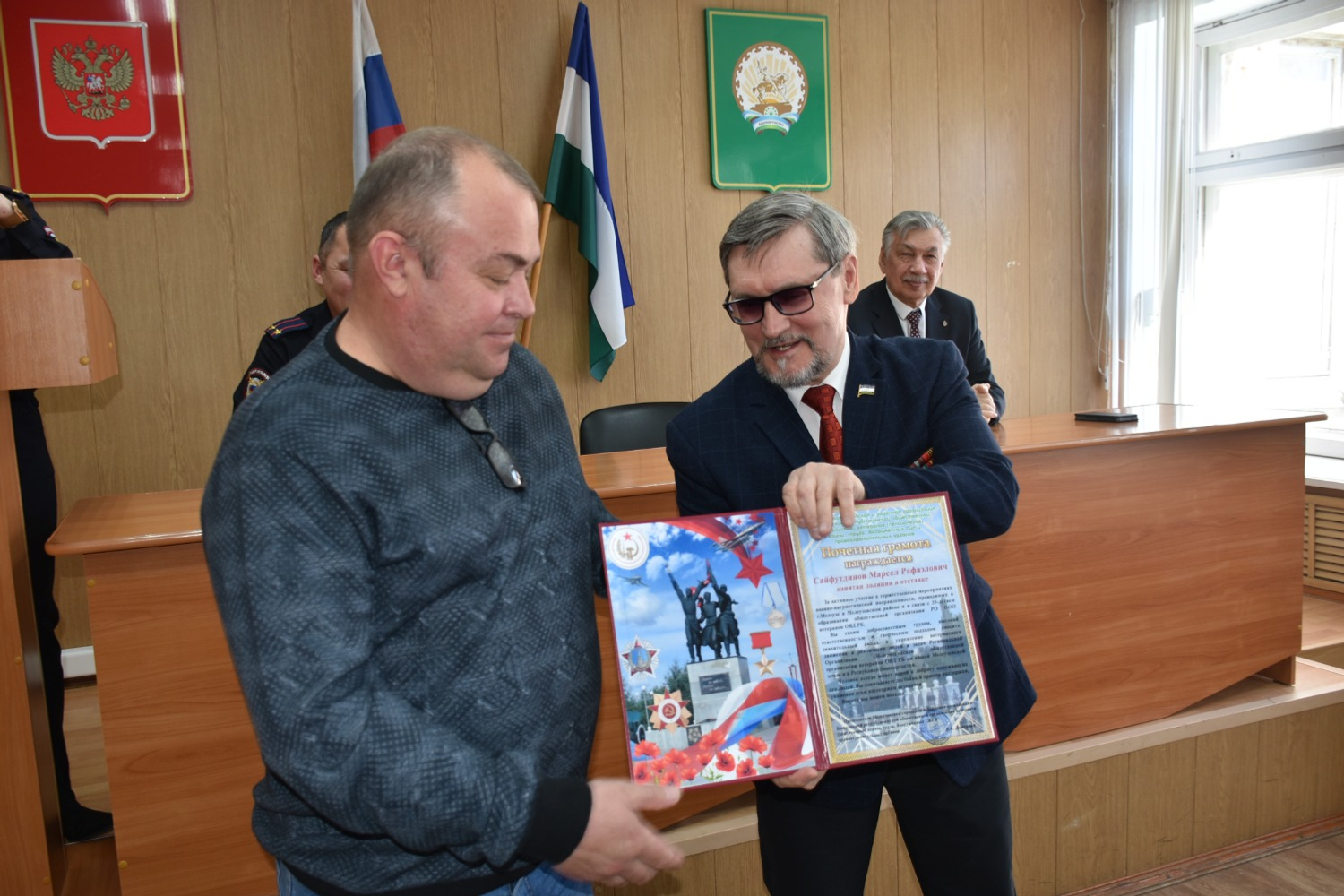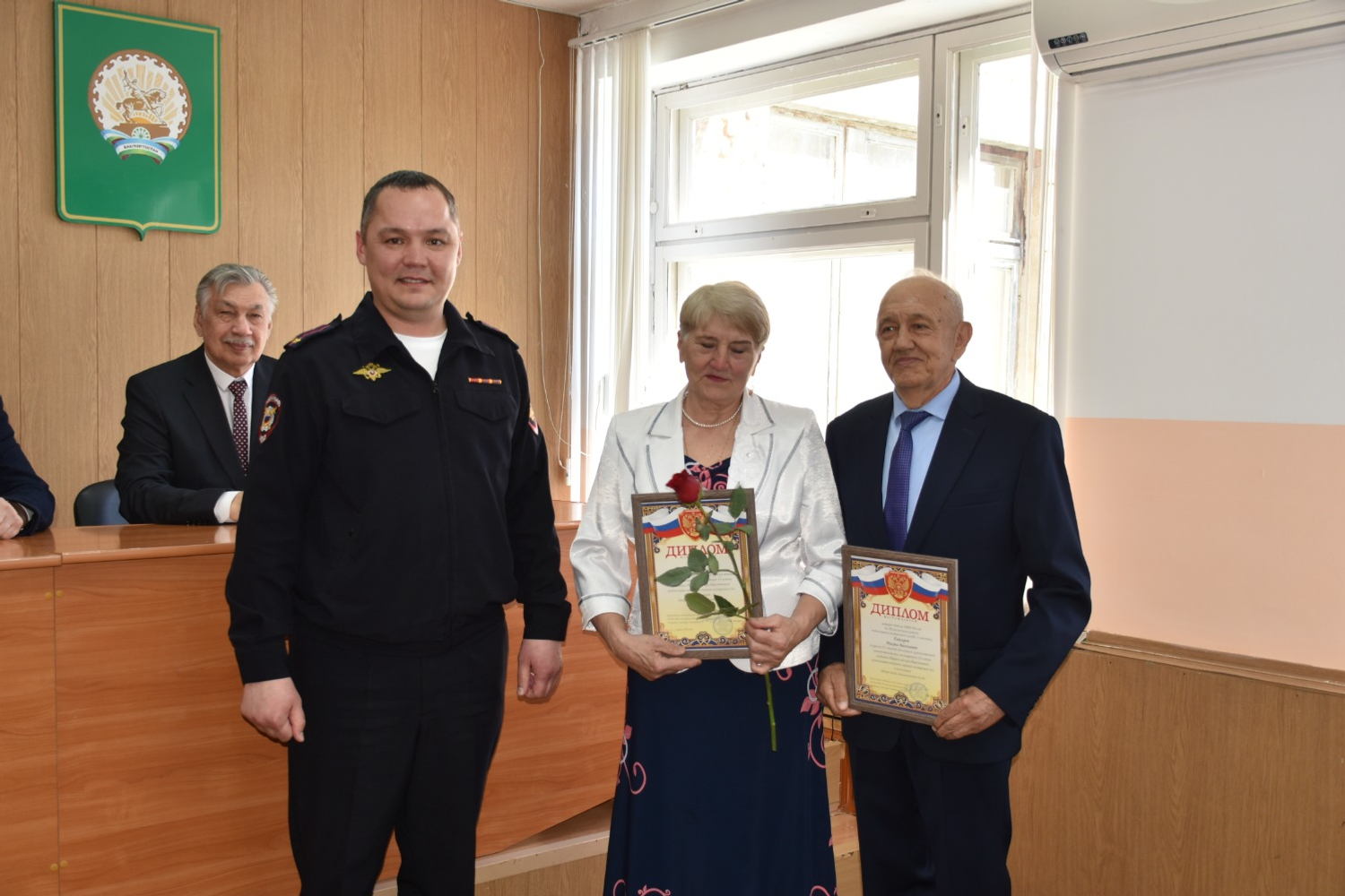 Заместитель начальника Отдела МВД - начальник полиции подполковник Давид Абдрахманов и председатель совета ветеранов войны и труда района и города подполковник Виктор Дмитриев, поздравив присутствующих, вручили награды ряду участников мероприятия.