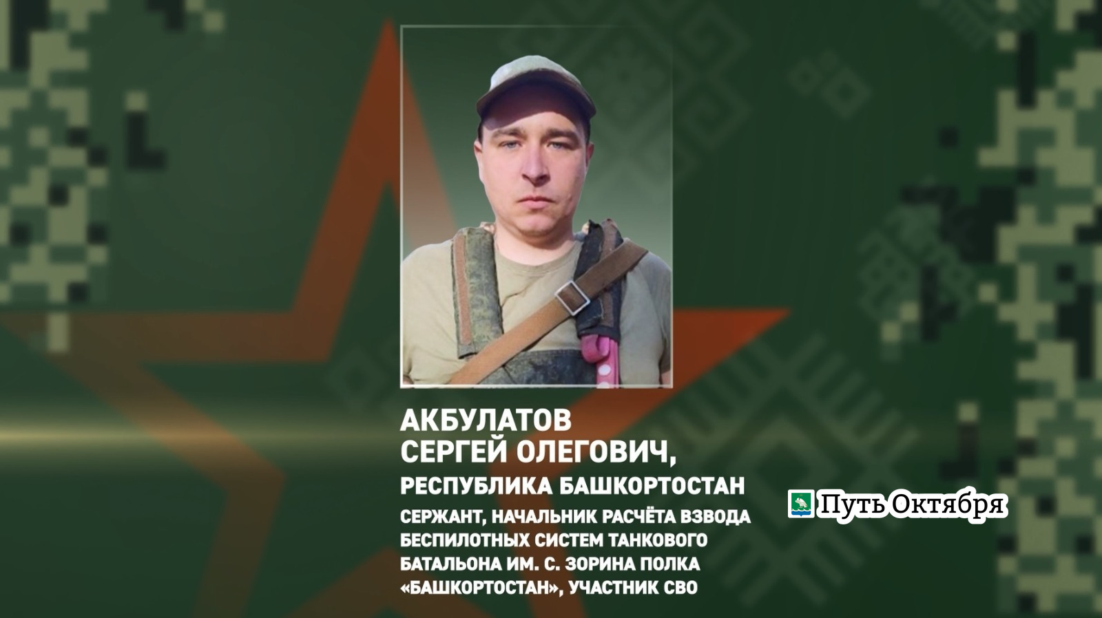Военнослужащий танкового батальона им. С. Зорина полка «Башкортостан» проявил в бою героизм и отвагу. Сержант, начальник расчёта взвода беспилотных систем Сергей Олегович Акбулатов в одном из боёв под плотным огнём противника корректировал огонь танка. После атаки дрона укронацистов в лесу начался пожар. Наш земляк, рискуя собой, предпринял решительные действия и спас однополчан, сохранив военную технику. За проявленные героизм и отвагу танкиста представили к государственной награде